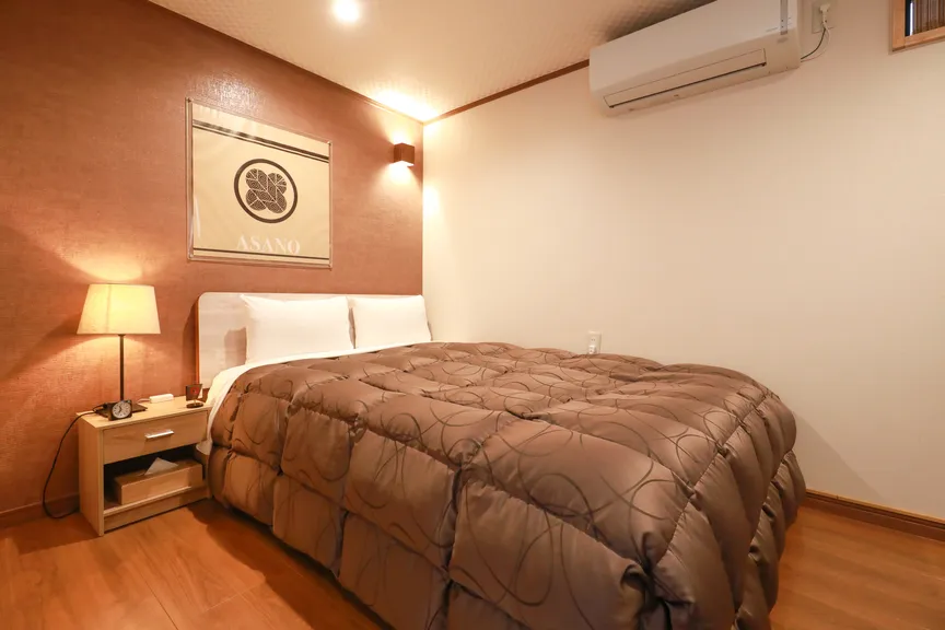 ダブルベッド1台 お部屋は階段を利用しての2階です 蔵INN家紋の2階のお部屋は玄関が他の2階のお部屋と共用となります(各お部屋には鍵付扉)